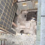 We have discovered fascinating historic remains following the demolition of the old link building. Stationers’ Hall has taken various forms over the last 500 years and we have found remains from just about all of them! Tudor door thresholds, medieval tiles, Georgian foundations and 50s concrete. Many of the old paving stones and bricks that have been unearthed have evidence of charring believed to be from when the Hall (although not the archive) was destroyed by the Great Fire of London in 1666.