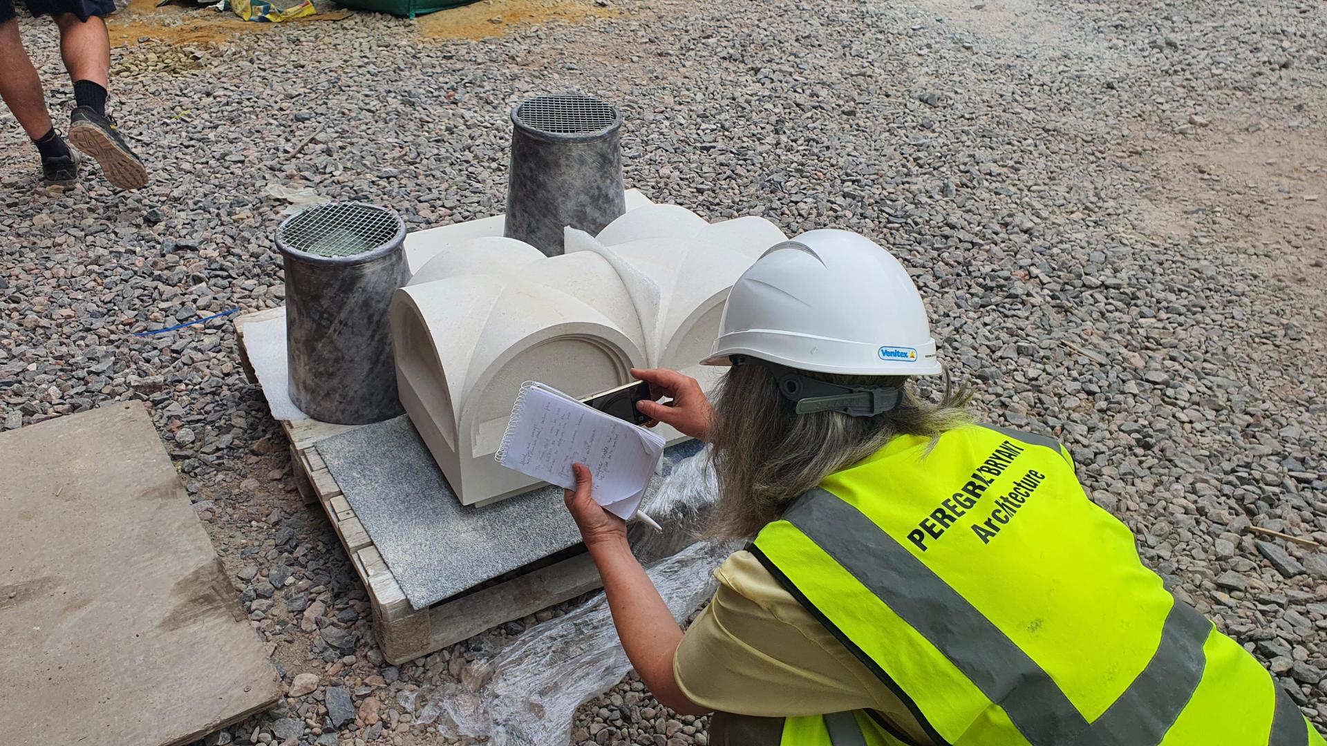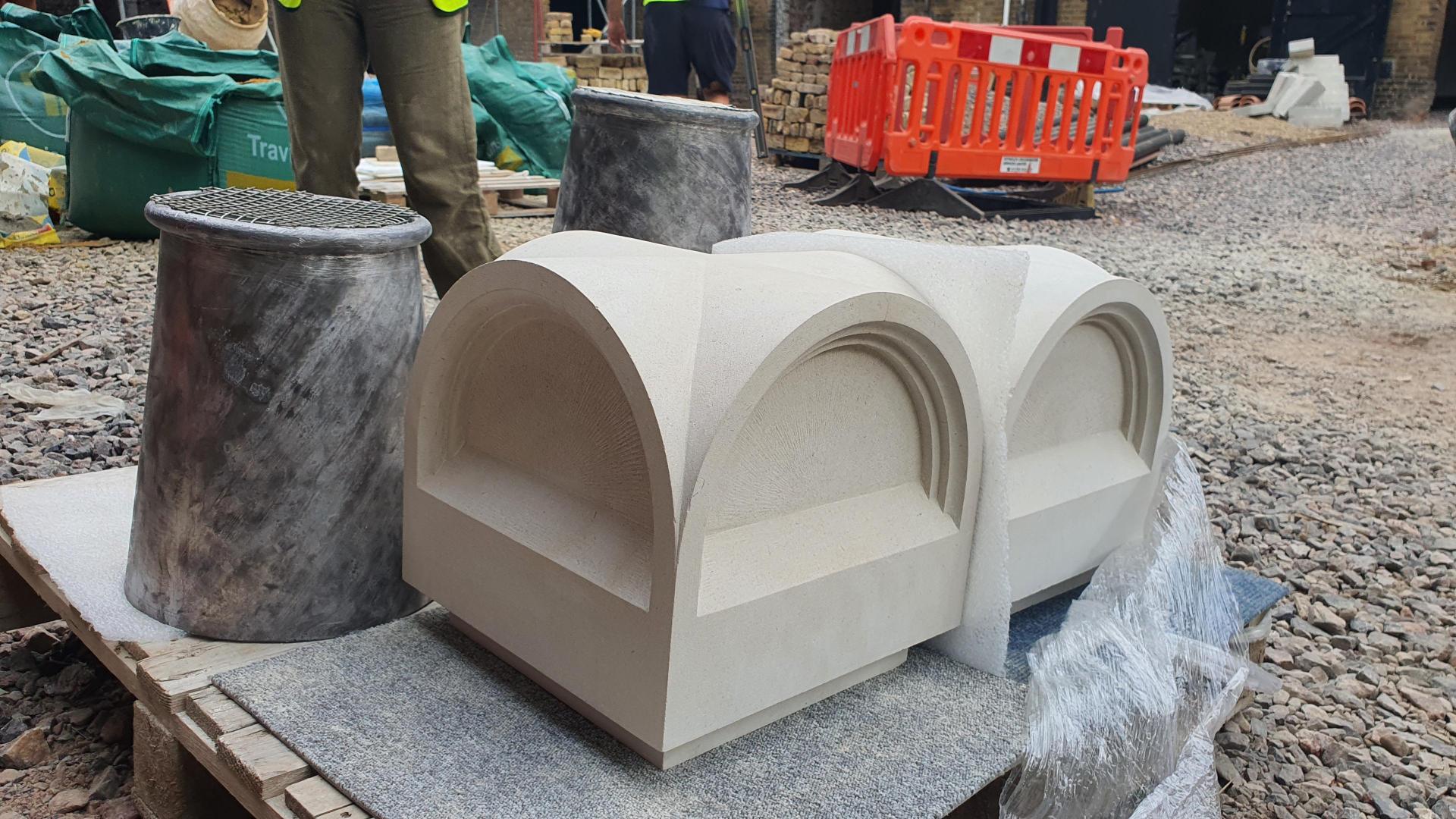 The new stone finials have arrived on site for the re-built chimneys. These delightful finials, shaped in Soane’s iconic four-sided dome motif, will sit on either side of the rebuilt stack. The stable block lost many of its chimneys following damage sustained during WWII and we have worked closely with the original drawings to replicate the lost elements.
